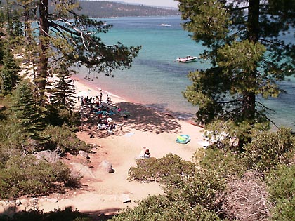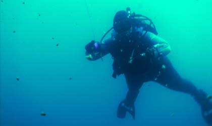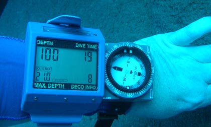 The ECOshot did get a workout of another kind, though. This was our first time at the Rubicon divesite. You get there via the Callawee Cove beach of D. L. Bliss state park. A 150 yard swim then gets you to a breathtaking wall dive, with a almost sheer rock cliff going from about 60 feet all the way down to about 1,400 feet. Once we'd located the wall, peered over it, and began descending into the abyss, adrenaline took over (at least for me), we watched our depth and felt the rapidly dropping water temperature, and the ECOshot's own 75-foot depth limit was forgotten. We took a picture at 100 feet, then went down to 110 (and a 48 degree water temperature). The ECOshot was unfazed and, we found later, none the worse for wear. All controls continued to operate normally even at that depth. We don't recommend taking a camera deeper than it's rated, but if push comes to shove, the ECOshot can go beyond its stated limits.