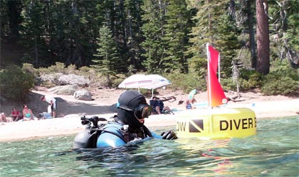 Once underwater, the ECOshot proved a handy companion. Without zoom or many other settings to worry about, I could just concentrate on taking pictures. I never had to hunt for the shutter as the one on the ECOshot is large and handy and hard to miss. Operating the controls was no big deal either, once I got used to handling the camera with my thick neoprene gloves. Between wearing a mask, being awed by the grandeur of the huge boulders in the Rubicon Wall dive site, and the smallish LCD, I often just pointed the camera in the general direction of what I wanted a picture of. It did well enough. While Tahoe is very clear, there is none of the color explosion you find on reefs, and so we couldn't really give the specialized underwater white balance modes much of a workout.