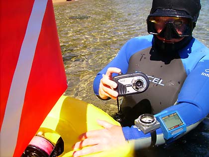 Above I mentioned the ECOshot's small number of controls. That is mostly a good thing when you shoot underwater, but since the water gets cold in Lake Tahoe when you get to 50 or 60 feet, we wore hoods and gloves, and I quickly found that it wasn't easy to operate the control buttons because they are so close together. They are also not very clearly marked, and whereas green is almost universally used to indicate playback, on the ECOshot green means "ok." Somehow, the buttons also rotate and the icons can point in any direction, so it's a good idea to practice some before a dive. Finally, there is one additional control to the left of the LCD. It switches back and forth between normal and macro mode. It is a recessed lever and goes so hard that I could not operate it with gloves on. Since the ECOshot can go no closer than two feet in normal mode, it is necessary to toggle back and forth between the focus modes. It's possible that something may have been wrong with the switch on ours as is sometimes the case with press loaners that may have seen a good deal of use (and abuse).