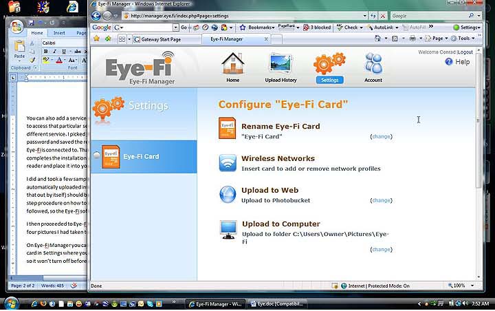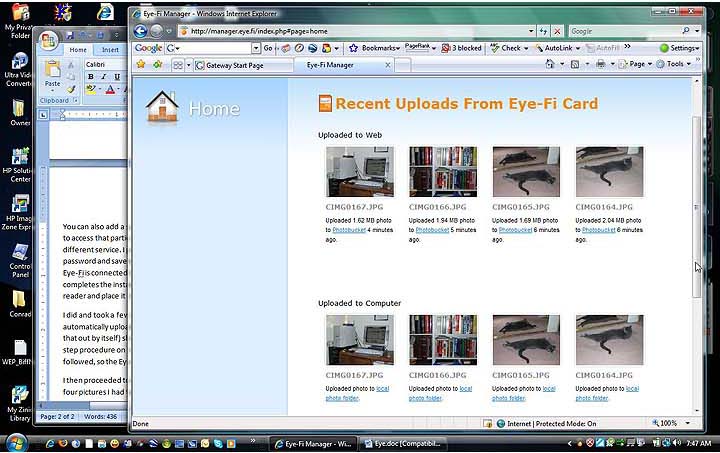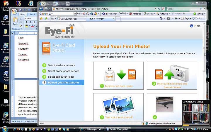 I then proceeded to Eye-Fi Manager and found that the card and software had not only uploaded the four pictures I had taken to my computer, but also already to PhotoBucket (which I had authorized). Below you can see the screen that instructs what to do after initial configuration. The little window at the right bottom pops up when the Eye-Fi card uploads pictures into your computer. It shows image file number and upload progress in percent.